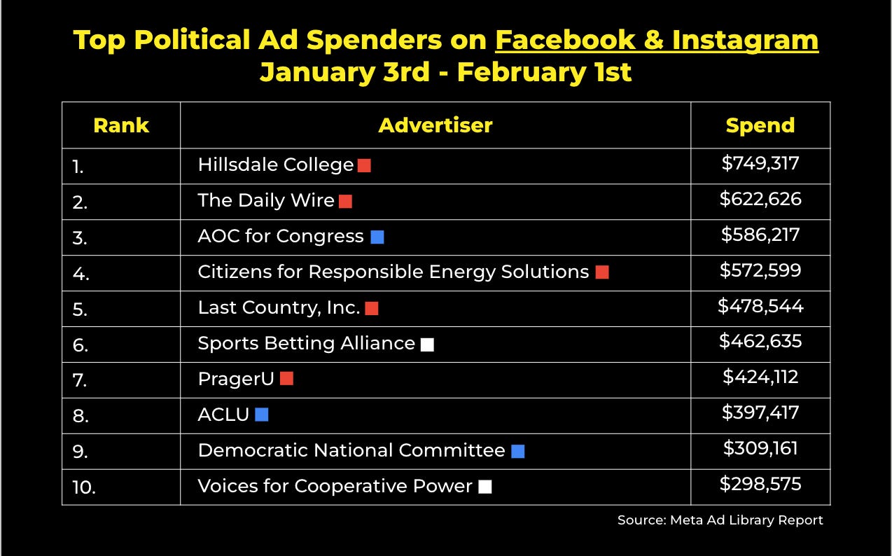 Meanwhile, political advertisers spent around $30.5 million on Facebook and Instagram ads in January 2025 (specifically, 1/3-2/1). These were the top ten spenders nationwide: