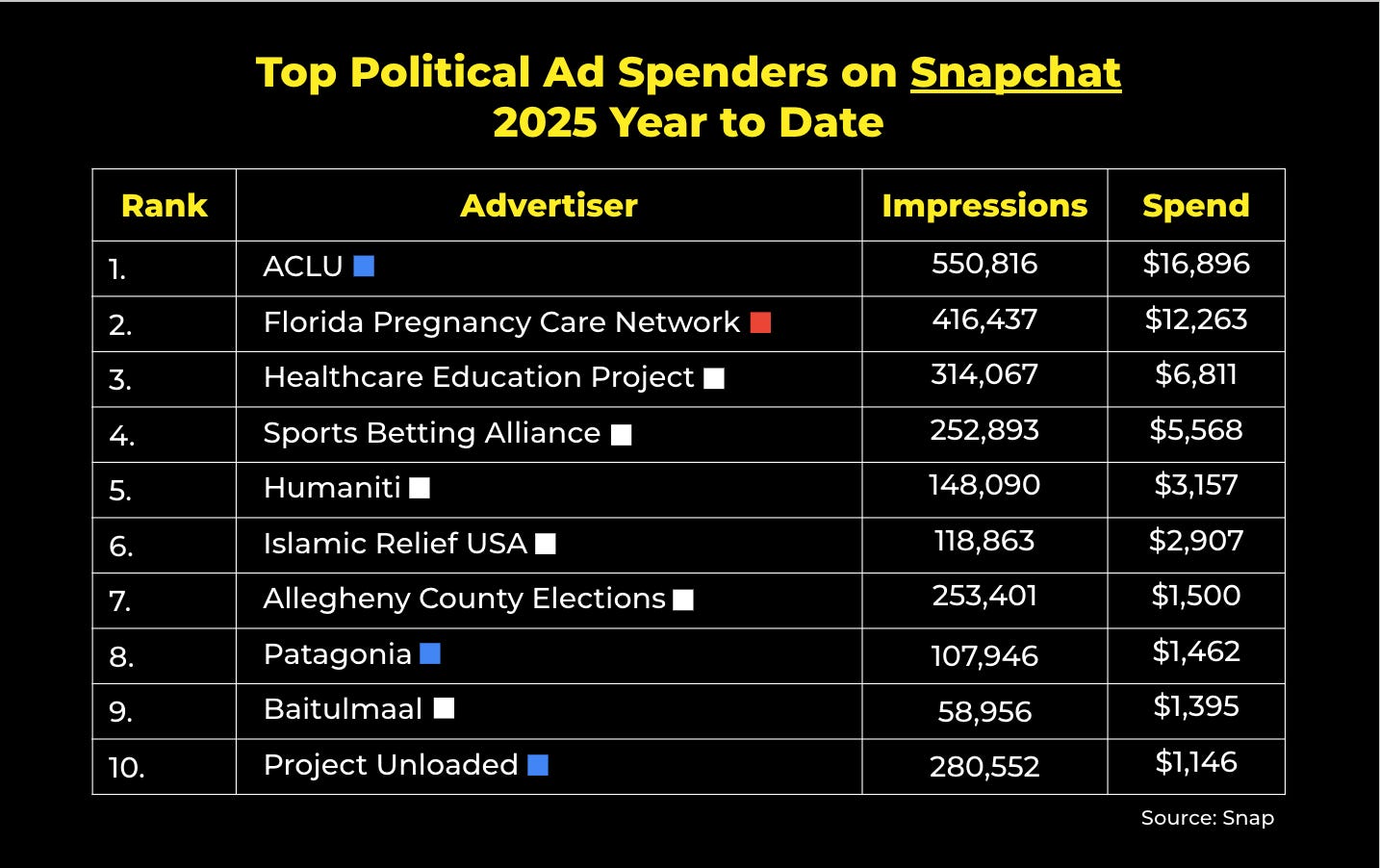 …and lastly, on Snapchat, political advertisers in the U.S. have spent around $54,800 on ads year to date in 2025. Here are the top spenders: