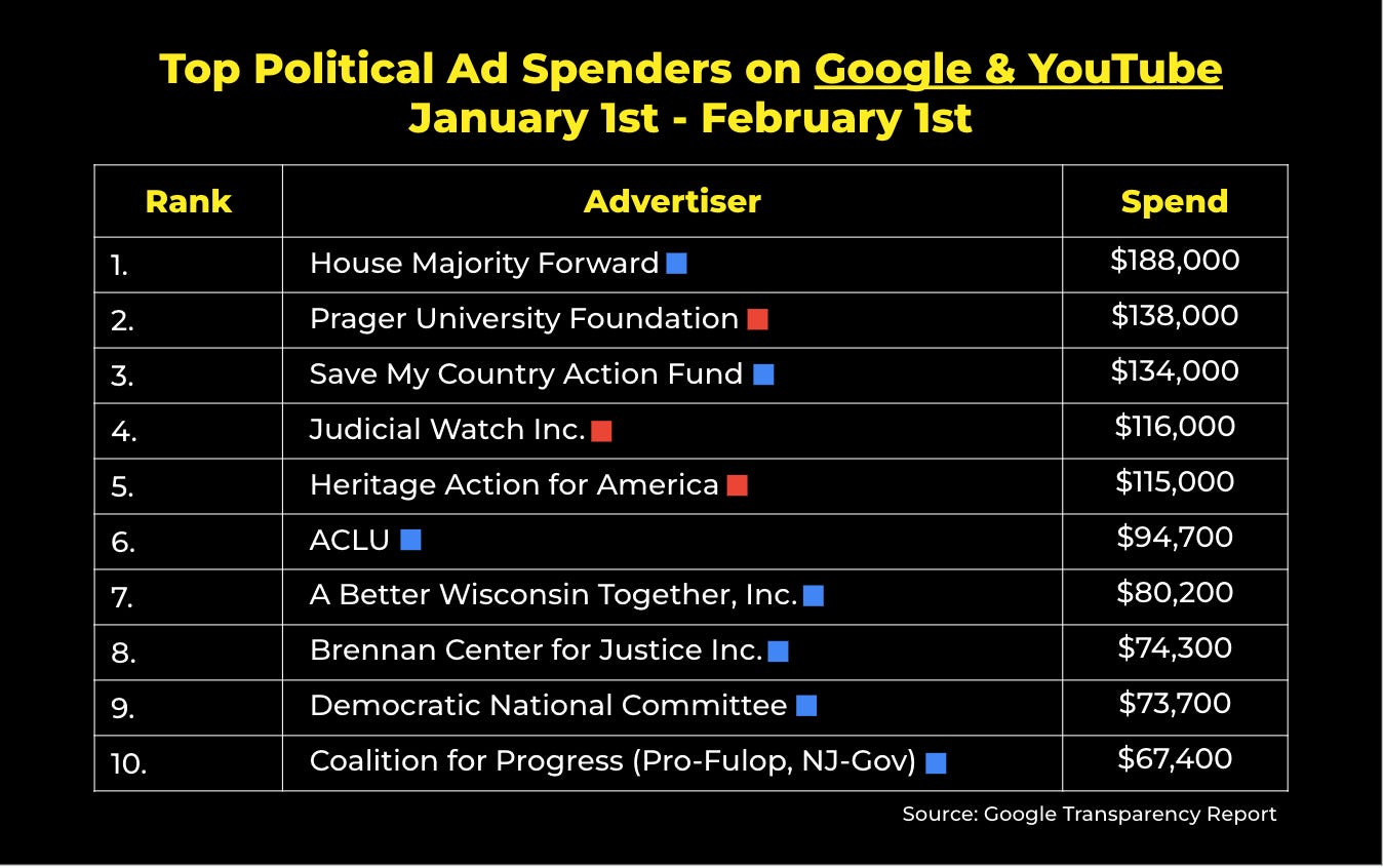 FWIW, U.S. political advertisers spent around $4.1 million on Google and YouTube ads in January 2025. Here were the top ten spenders nationwide: