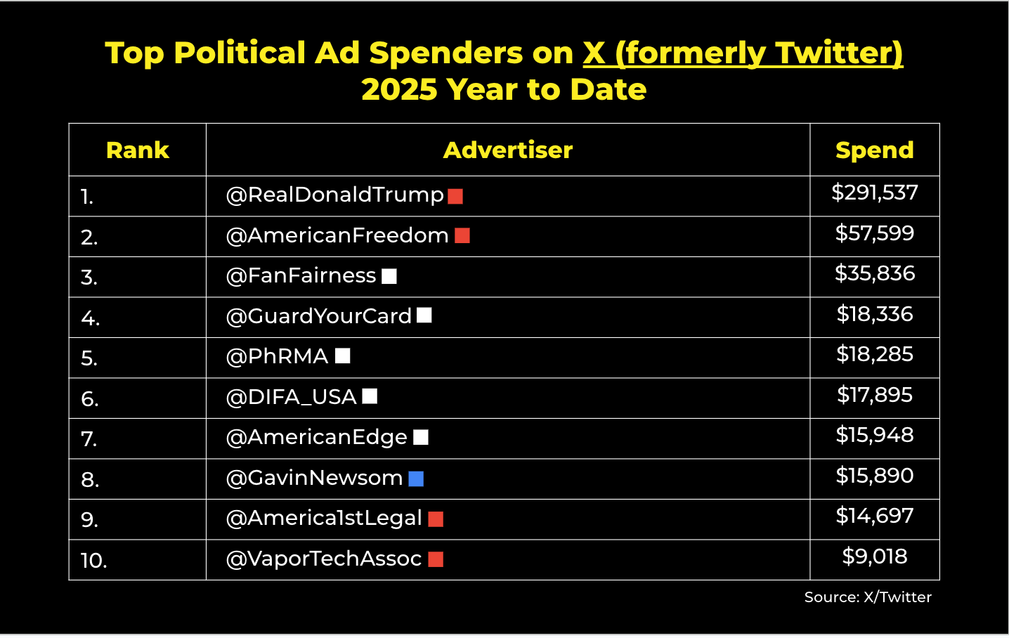 On X (formerly Twitter), political advertisers in the U.S. spent around $668,300 on ads year to date in 2025. According to X’s political ad disclosure, here are the top spenders year to date: