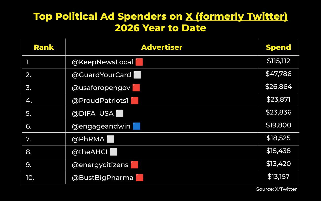On X (formerly Twitter), political advertisers in the U.S. have spent around $627K on ads so far in 2026. According to X’s political ad disclosure, here are the top spenders year to date: