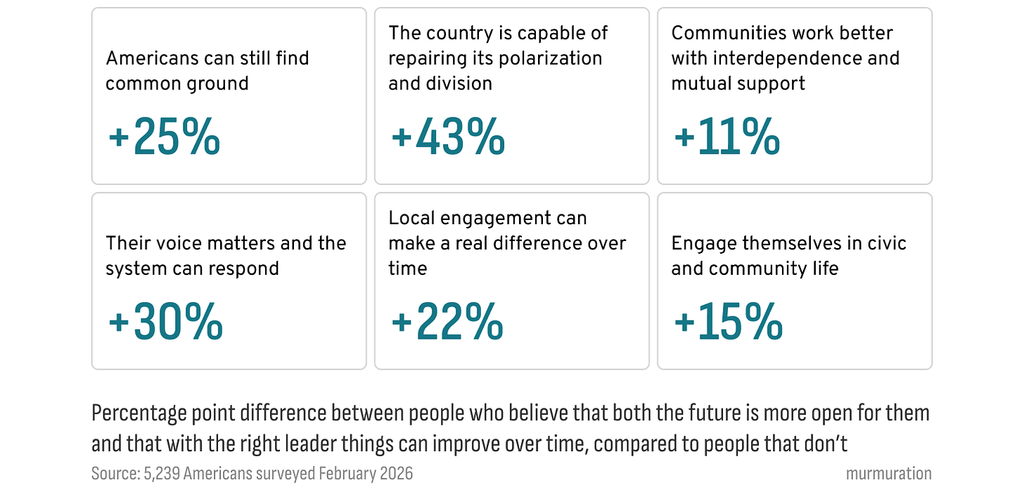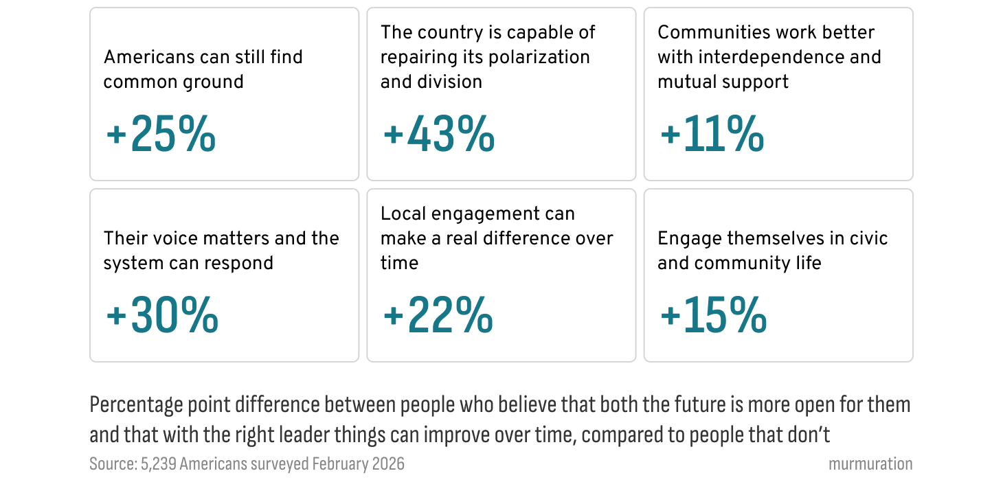 The encouraging signal in the data is that most Americans still believe in each other and that change is possible, especially close to home. At a moment when the future feels hard to picture, leadership that makes progress visible, lowers threat, and stays oriented toward the long term may be one of the most important civic interventions we have.