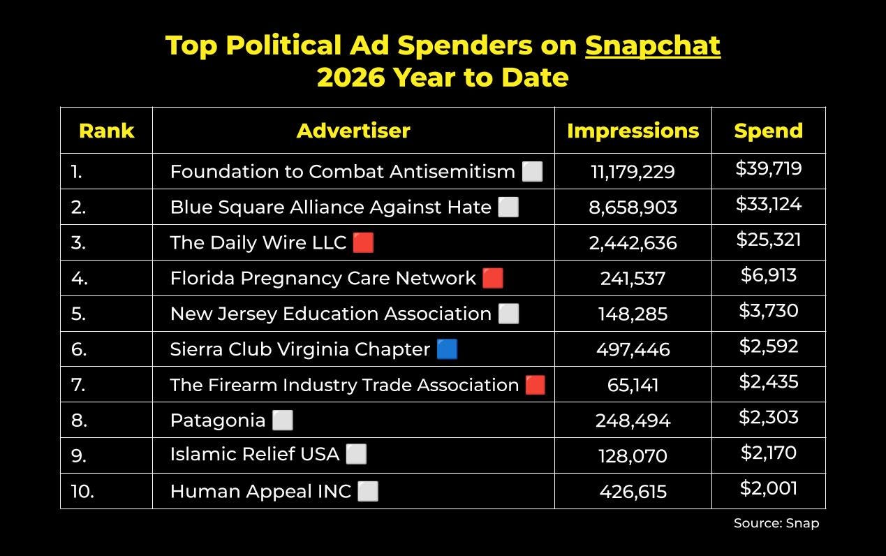…and lastly, on Snapchat, political advertisers in the U.S. have spent just under $132K on ads in 2026. Here are the top spenders year to date: