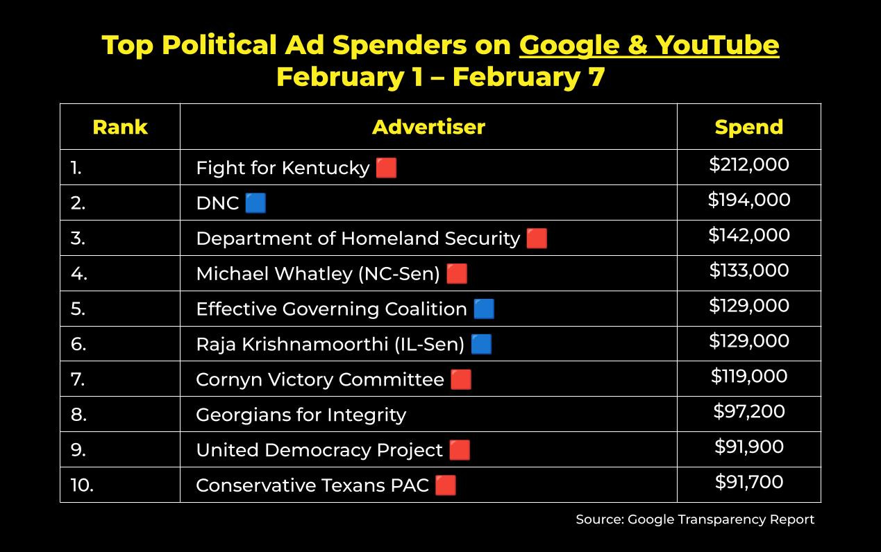 Meanwhile, political advertisers spent around $4.5 million on Google and YouTube ads last week. These were the top ten spenders nationwide: