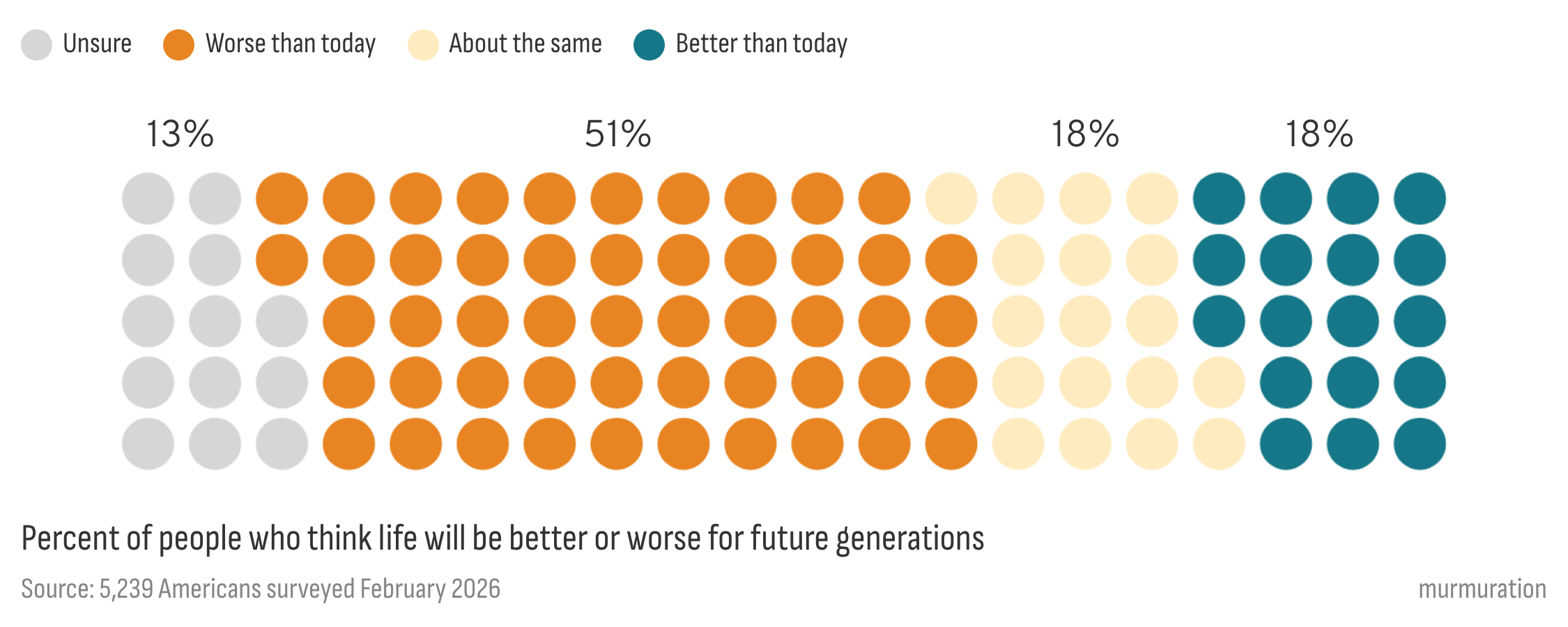 Across multiple questions, Americans describe a future that feels compressed, fragile, and difficult to imagine beyond the near term. A majority believe life for the next generation will be worse than it is today (51%), far outpacing the share who expect it to be better (18%), down dramatically from 2022.