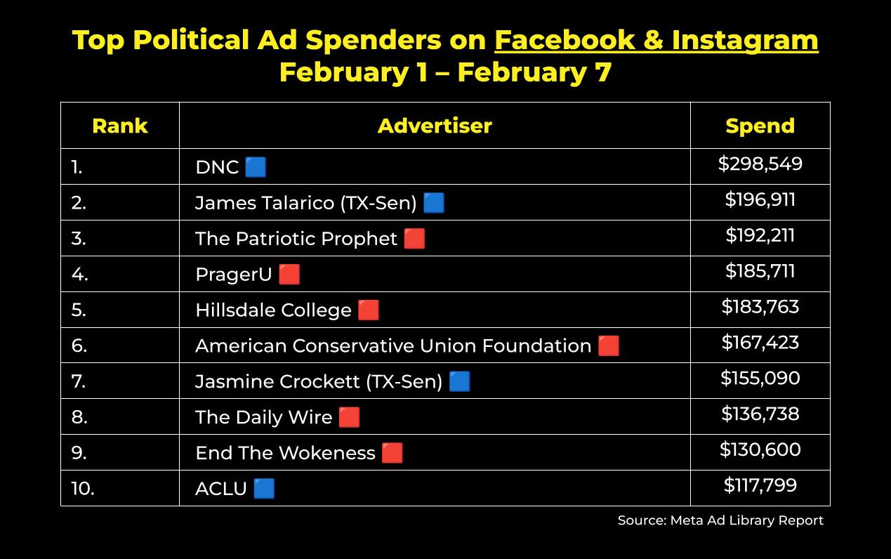FWIW, U.S. political advertisers spent about $12.5 million on Facebook and Instagram ads last week. Here were the top ten spenders nationwide: