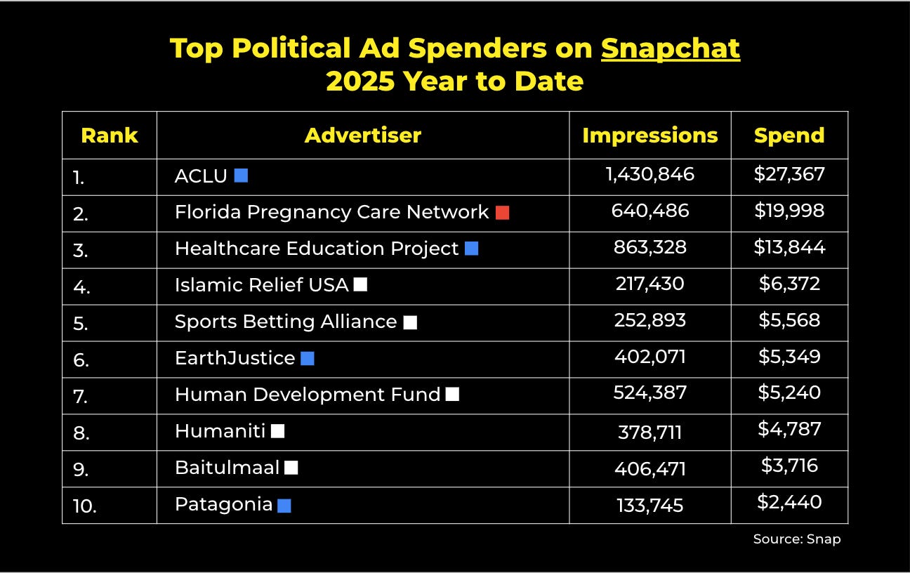 …and lastly, on Snapchat, political advertisers in the U.S. have spent around $105,000 on ads in 2025. Here are the top spenders year to date: