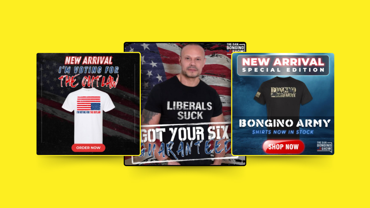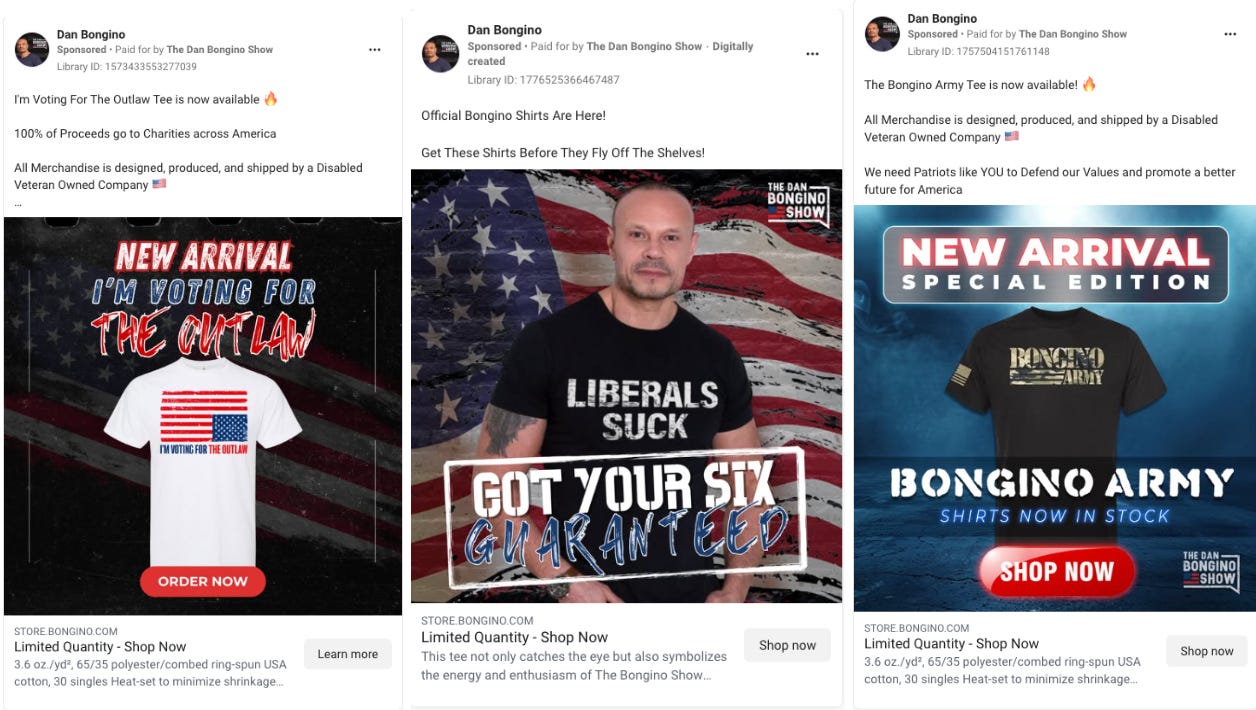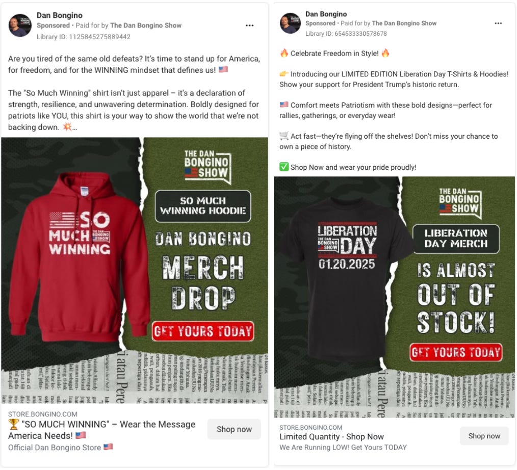 In the past three months (Nov 2024 to Feb 2025), Dan Bongino spent ~$28,000 on Facebook + Instagram ads promoting his show’s merch. This isn’t inherently shocking – but that’s where the merch itself comes in. Here are examples of ads that have run under his name in the past three months: