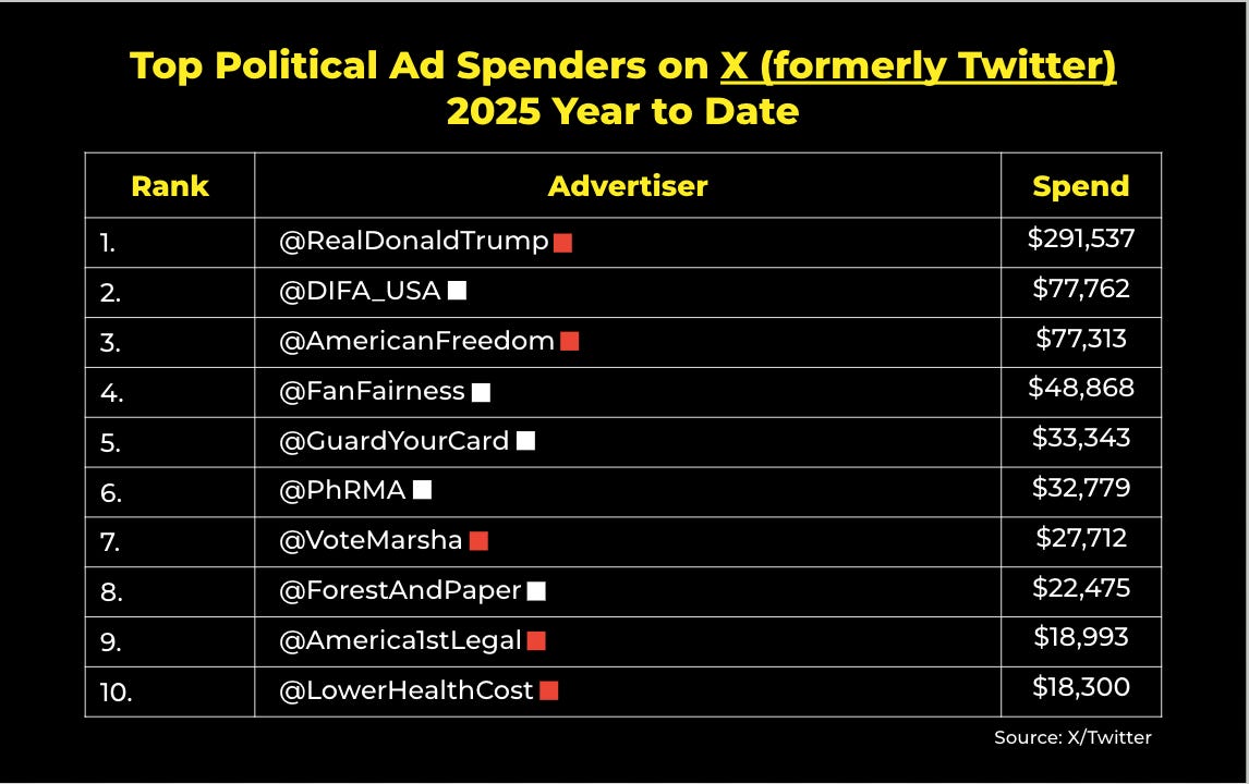 On X (formerly Twitter), political advertisers in the U.S. have spent around $1.1 million on ads in 2025. According to X’s political ad disclosure, here are the top spenders year to date: