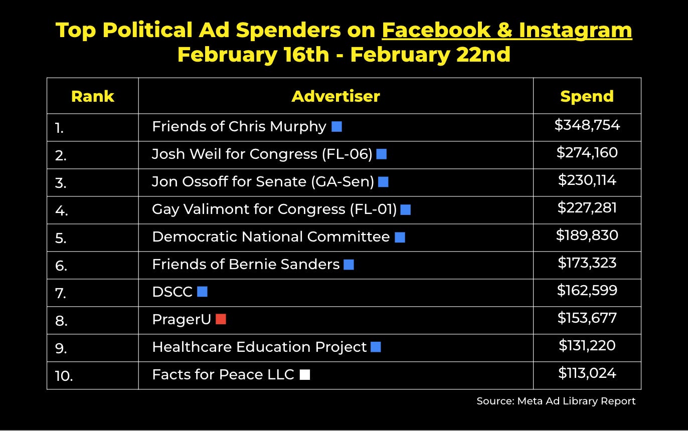FWIW, U.S. political advertisers spent about $10 million on Facebook and Instagram ads last week. Here were the top ten spenders nationwide: