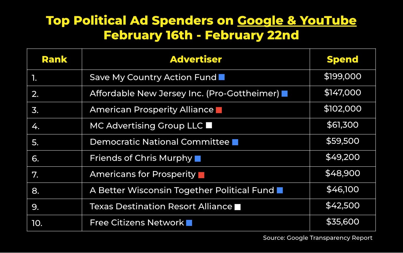 Meanwhile, political advertisers spent just over $1.7 million on Google and YouTube ads last week. These were the top ten spenders nationwide: