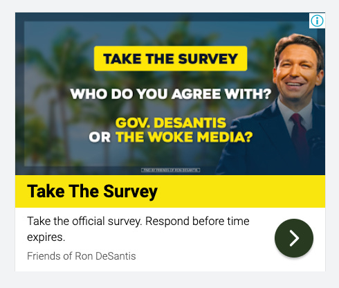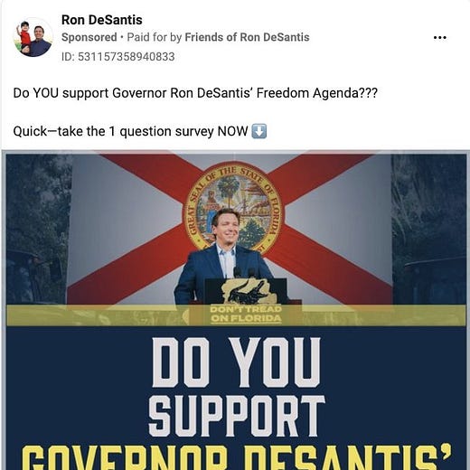 It’s unusual for a term-limited politician to continue running fundraising and email acquisition ads after winning re-election - unless he or she is planning to seek higher office. DeSantis is widely rumored to be planning a run for President in 2024, and will need to quickly build a large base of grassroots supporters to fund that effort.