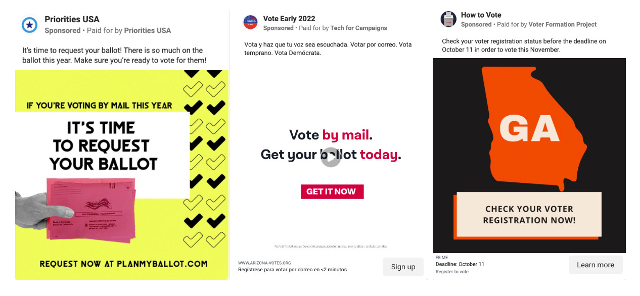 We’ve now reached the stage in the election when a number of partisan and nonpartisan groups begin large-scale attempts to make sure voters are ready for early voting, casting or requesting mail-in ballots, or Election Day itself. On Facebook, that means hundreds, if not thousands of ads from groups like Priorities USA, Tech for Campaigns, Voter Formation Project.