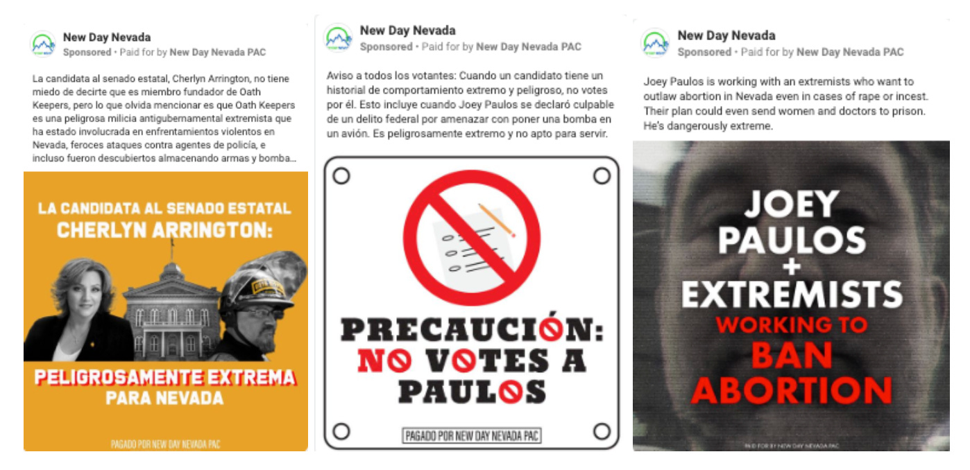 Nevada is another state that is seeing medium to large-scale digital ad investments from progressive outside groups in state legislative contests. The top spending advertiser in this regard is a group called New Day Nevada, which has spent more than $350,000 on Facebook ads over the past 90 days. That organization is hammering Republican candidates with attack ads in English and Spanish related to abortion and extremism.