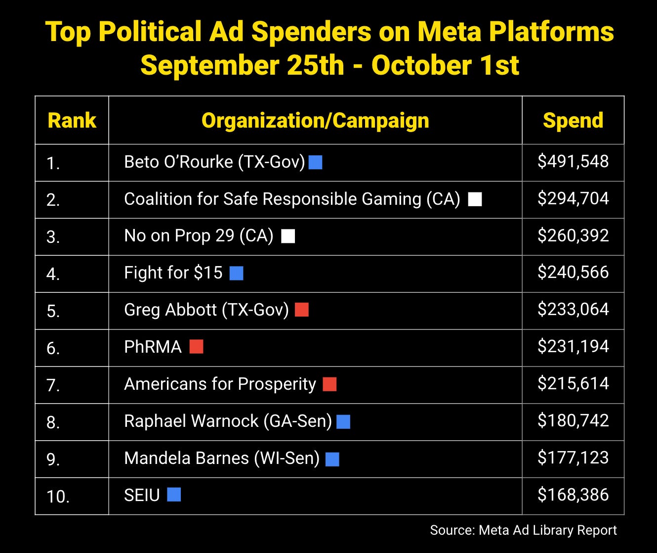 FWIW, here were the top-spending political advertisers on Facebook + Instagram last week: