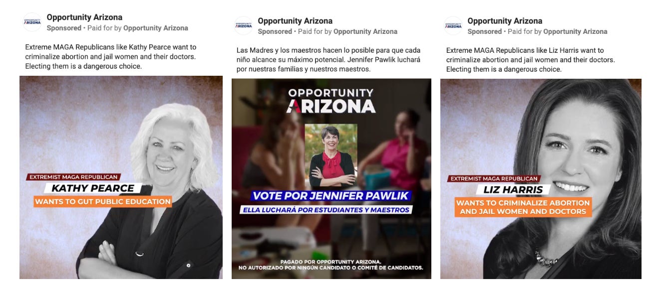 One progressive organization, Opportunity Arizona, appears to be the largest advertiser on Facebook in these races - spending a little over $30,000 in the past few months attacking Republican candidates for their abortion positions and extremist MAGA ties as well as supporting Democrats on the ballot.
