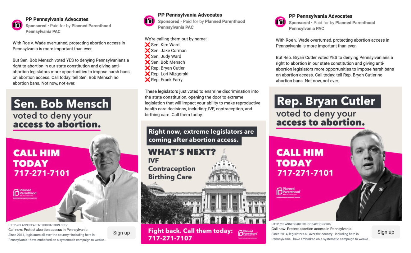Pennsylvania has also seen limited investment in digital ads supporting or opposing state legislative candidates - the exception comes from a few progressive outside groups. First, Planned Parenthood’s Pennsylvania affiliate is blanketing the state on Facebook attacking Republican legislators on yep, you guessed it - abortion rights. The group has spent over $52,000 on these ads in the past 90 days, as well a few thousand bucks on YouTube: