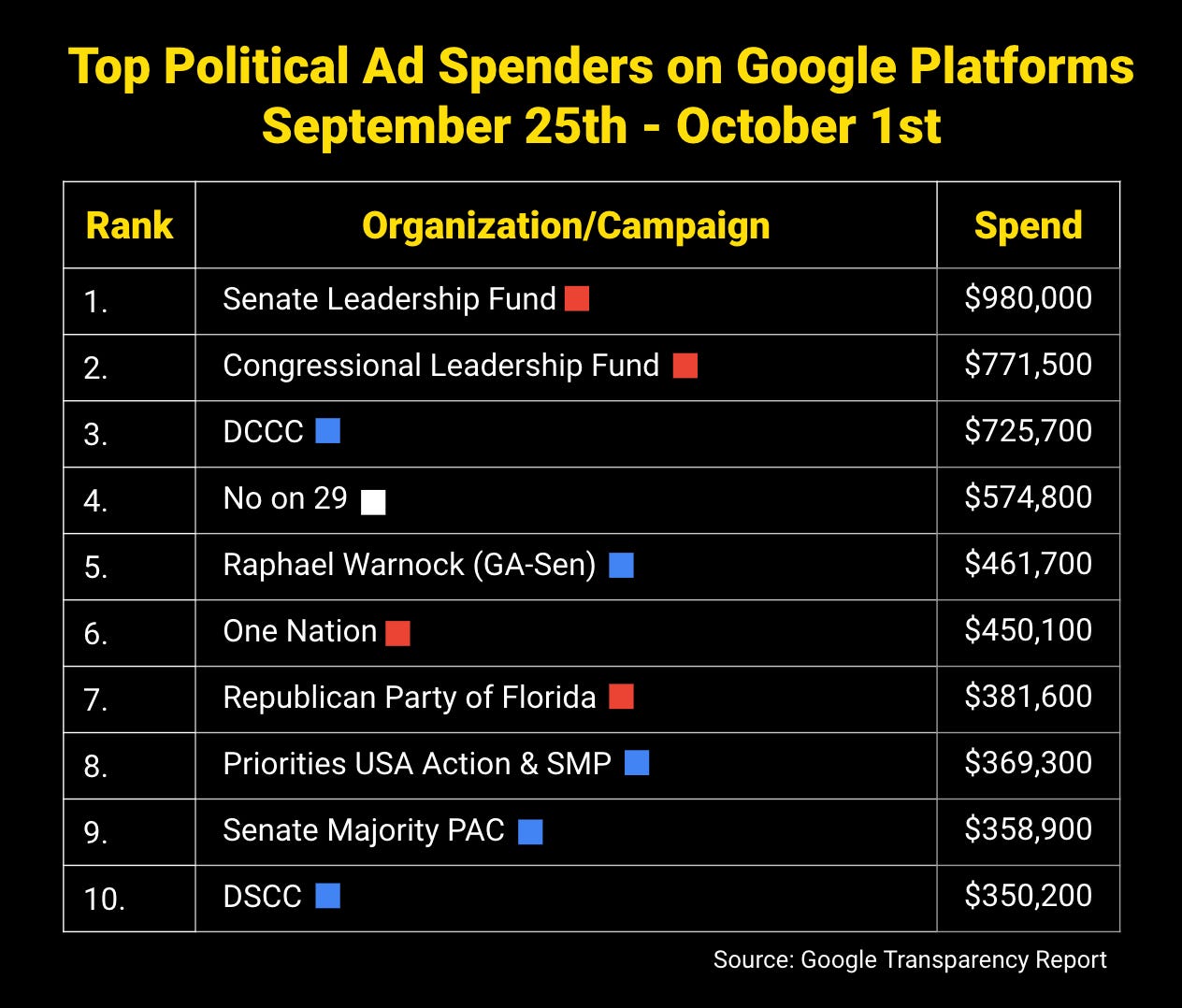 Meanwhile, here were the top political advertisers on Google platforms last week, including YouTube: