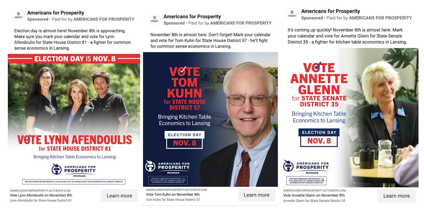 Conservatives in Michigan haven’t allowed these ads to go completely unanswered. The Koch-brothers backed Americans for Prosperity and Americans for Prosperity Action Fund seem to be the largest spenders on down-ballot digital ads in the state, promoting their own endorsed candidates to voters in pretty generic ads: