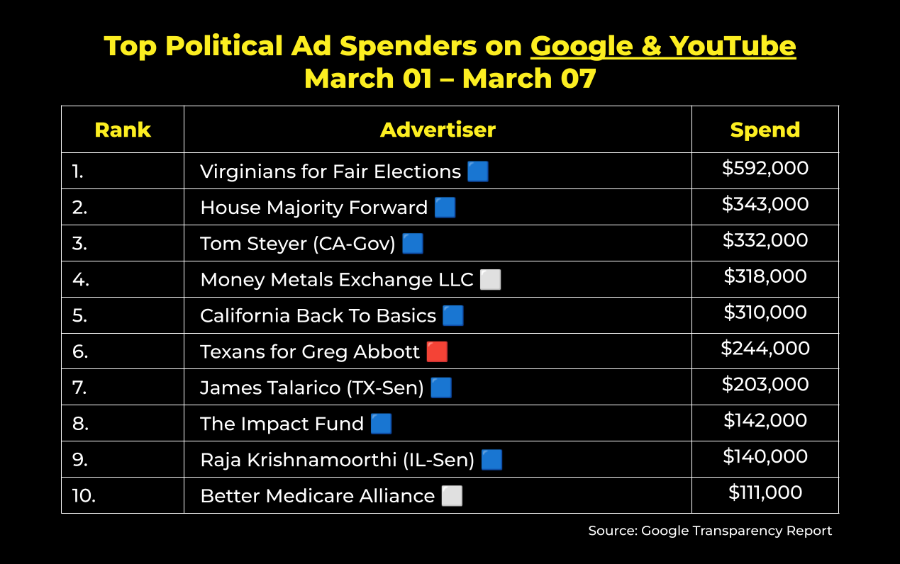 Meanwhile, political advertisers spent just over $7.8 million on Google and YouTube ads last week. These were the top ten spenders nationwide: