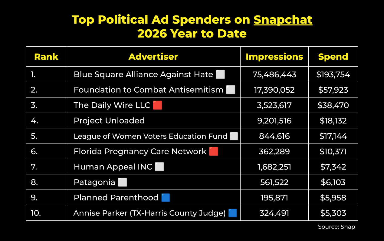 …and lastly, on Snapchat, political advertisers in the U.S. have spent around $422,000 on ads in 2026. Here are the top spenders year to date: