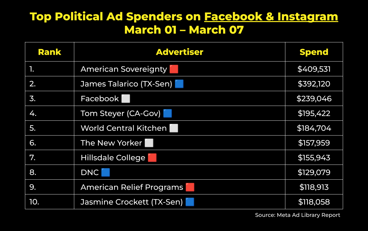 Topping this week’s list is American Sovereignty – a mysterious conservative group that launched in January. They followed up their pro-ICE Super Bowl ad with new ads encouraging people to “let ICE do their jobs.” Though the message feels like it could be straight from the White House, there’s no public connection. Putting the capital D in Dark money!