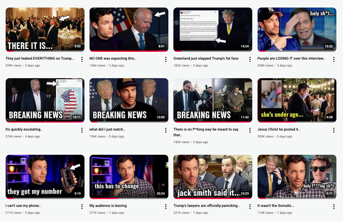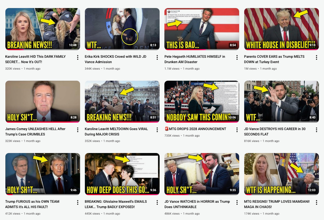 Other large progressive channels are starting to shift their tone and packaging too. That’s good. Because while the right is insane, they know how to make their content look approachable. Ours often doesn’t. Nobody wants to share a video—no matter how good it is—when the thumbnail is Trump’s face and the title is dialed to 12.