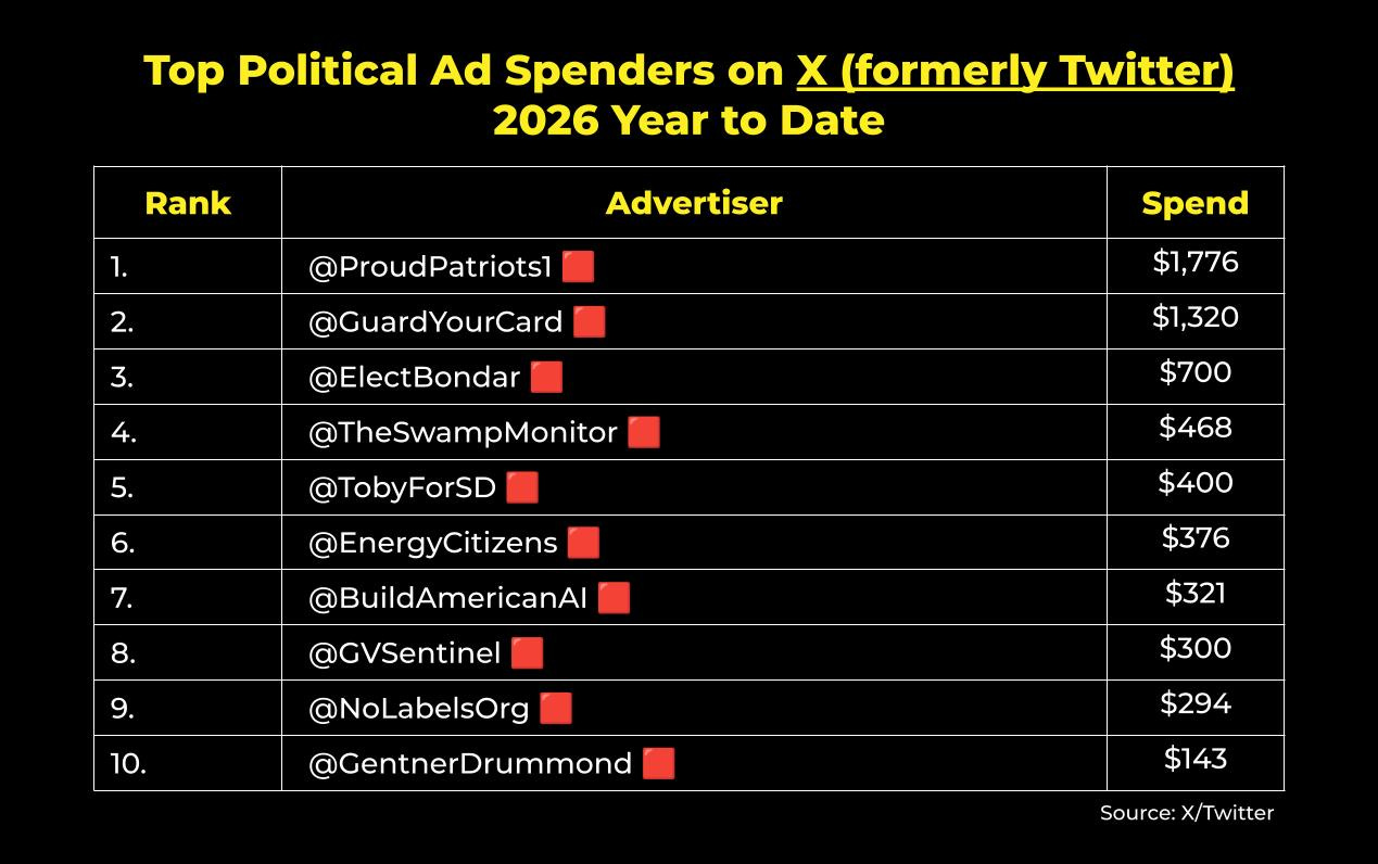 On X (formerly Twitter), political advertisers in the U.S. have spent just $6,700 on ads in 2026 so far. According to X’s political ad disclosure, here are the top spenders year to date… very much presented without comment, but if you’ve been on Twitter/X lately, this won’t come as a surprise: