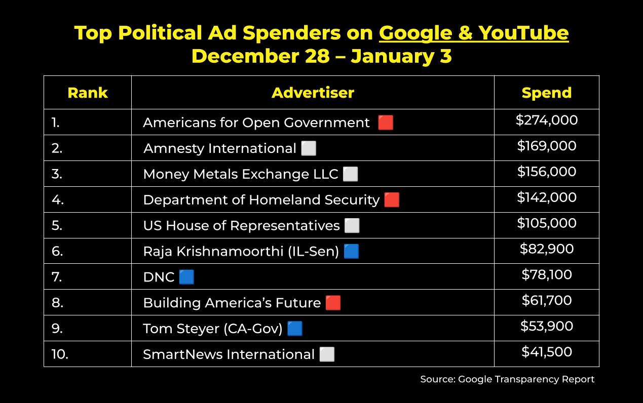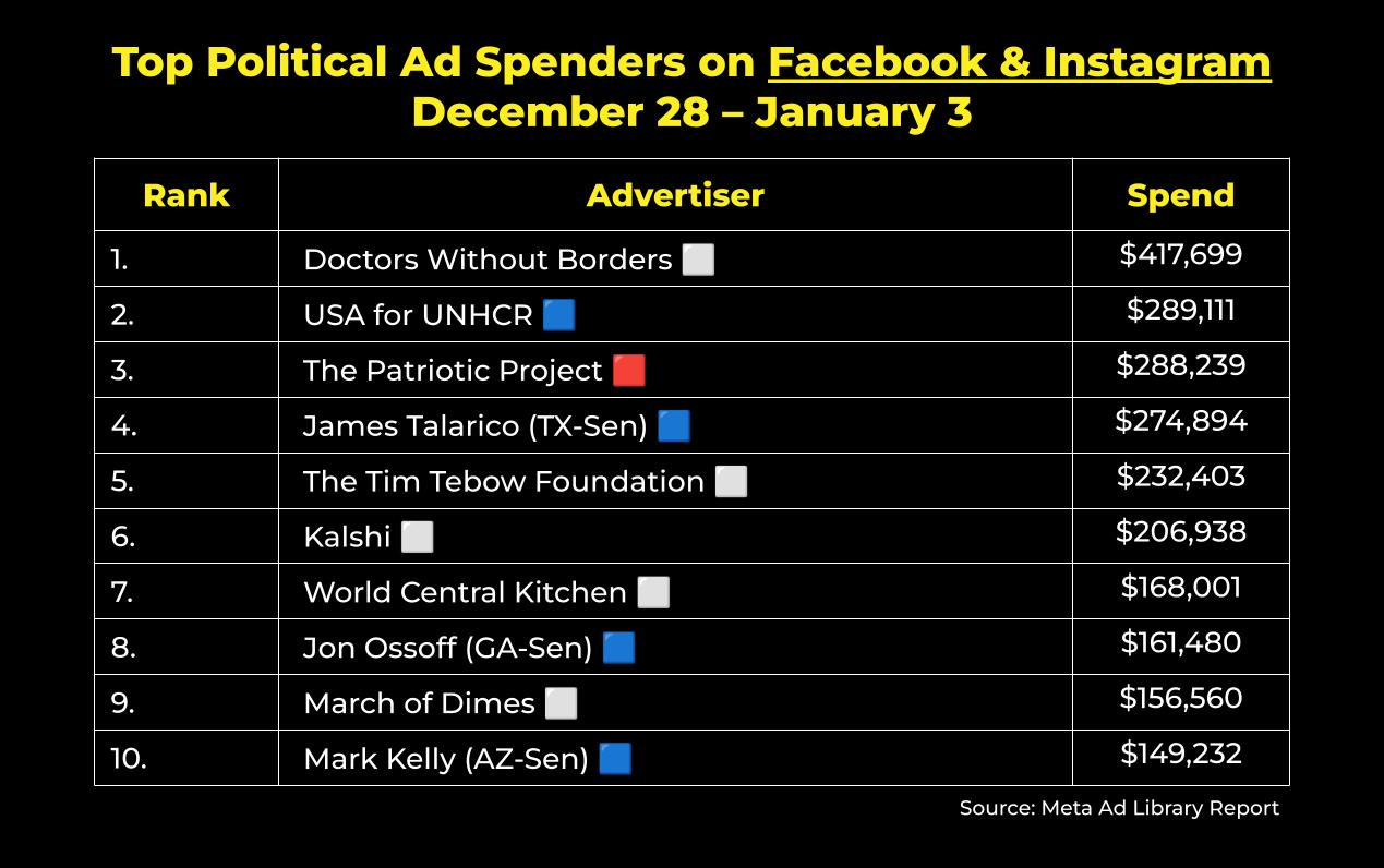 Three Democratic senate candidates, Talarico, Ossoff, and Kelly, cracked the top 10 list, collectively spending over half a million dollars on Meta ads last week. The GOP side of the aisle was notably absent, perhaps focusing their efforts on a different platform (see below).