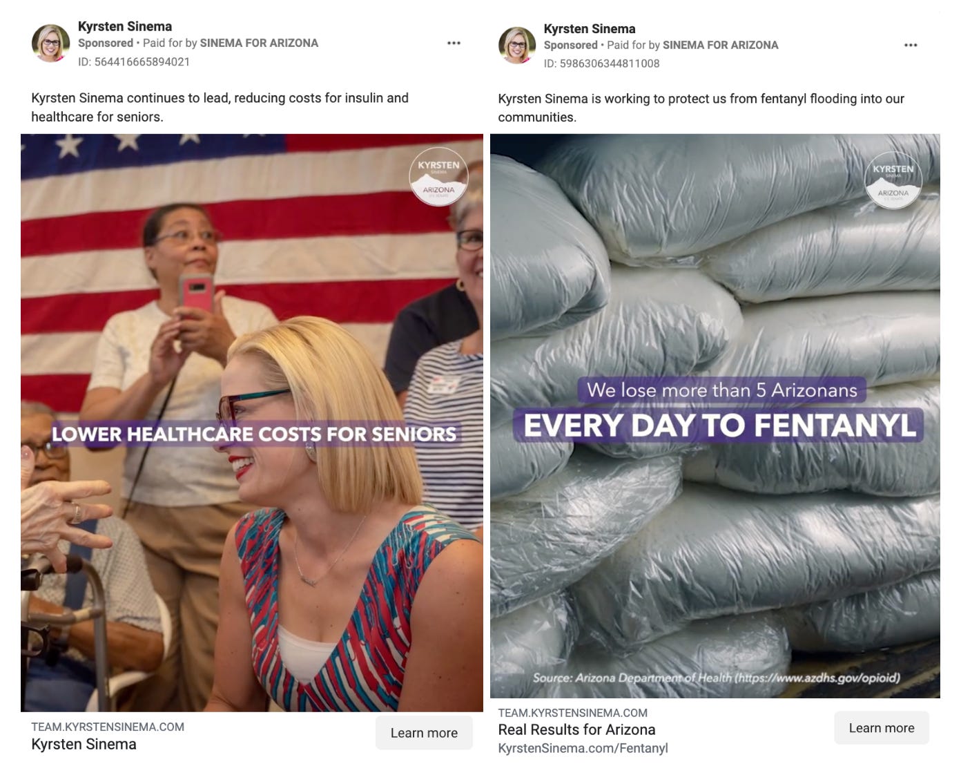 On Facebook, Sinema’s ads overwhelmingly target Arizonans - making her campaign the second highest political advertiser on the platform in the state in the past 90 days, after a climate advocacy group. Her most recent ads have focused on two themes that seem to be poll-tested for a general election audience: (1) fentanyl and border security, and (2) lowering healthcare costs & insulin prices.