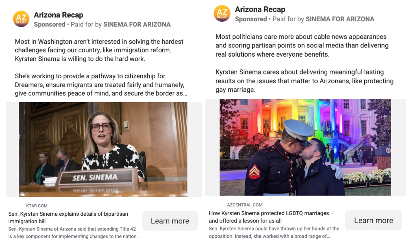 In late January, her team created a new Facebook page called “The Arizona Recap” to run “boosted news” ads promoting coverage that is favorable to Sinema. This type of persuasion-focused ad strategy is generally uncommon this early in the cycle.