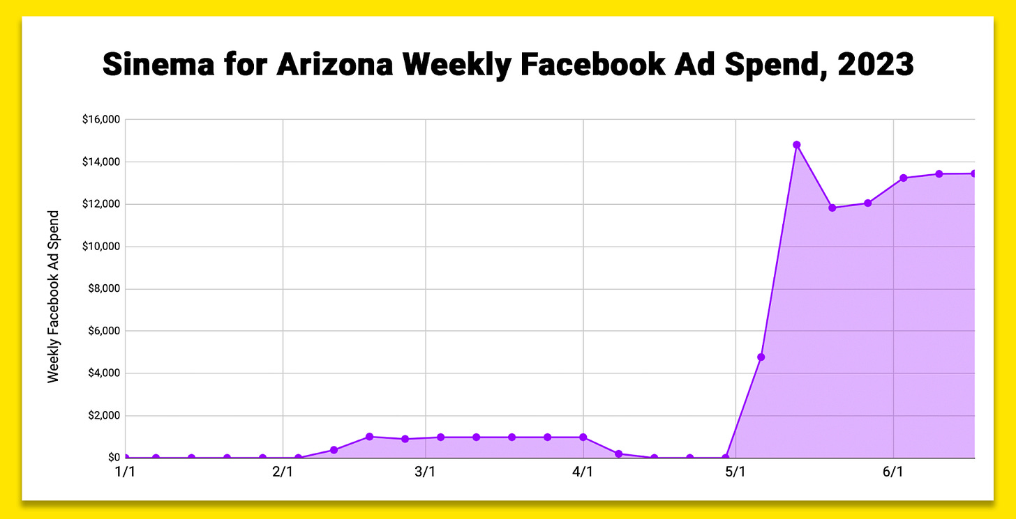 Most notably, Sinema for Arizona has spent over $100,000 on digital ads in 2023 targeting Arizona voters on Facebook and Instagram. In the last month, her team has outspent their likely Democratic opponent, Ruben Gallego, by a solid margin, as well as the campaigns of incumbent Senators in other contentious states, like Jon Tester, Sherrod Brown, and Tammy Baldwin.