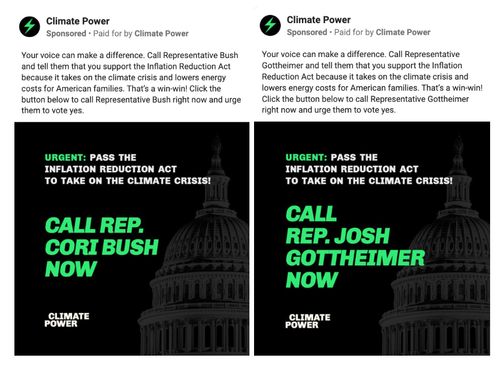 Now, with Senate Democrats on board, Climate Power immediately pivoted to wrangling potentially problematic House Democrats - launching ads this morning targeting conserva-dems like Josh Gottheimer and progressives like Cori Bush.