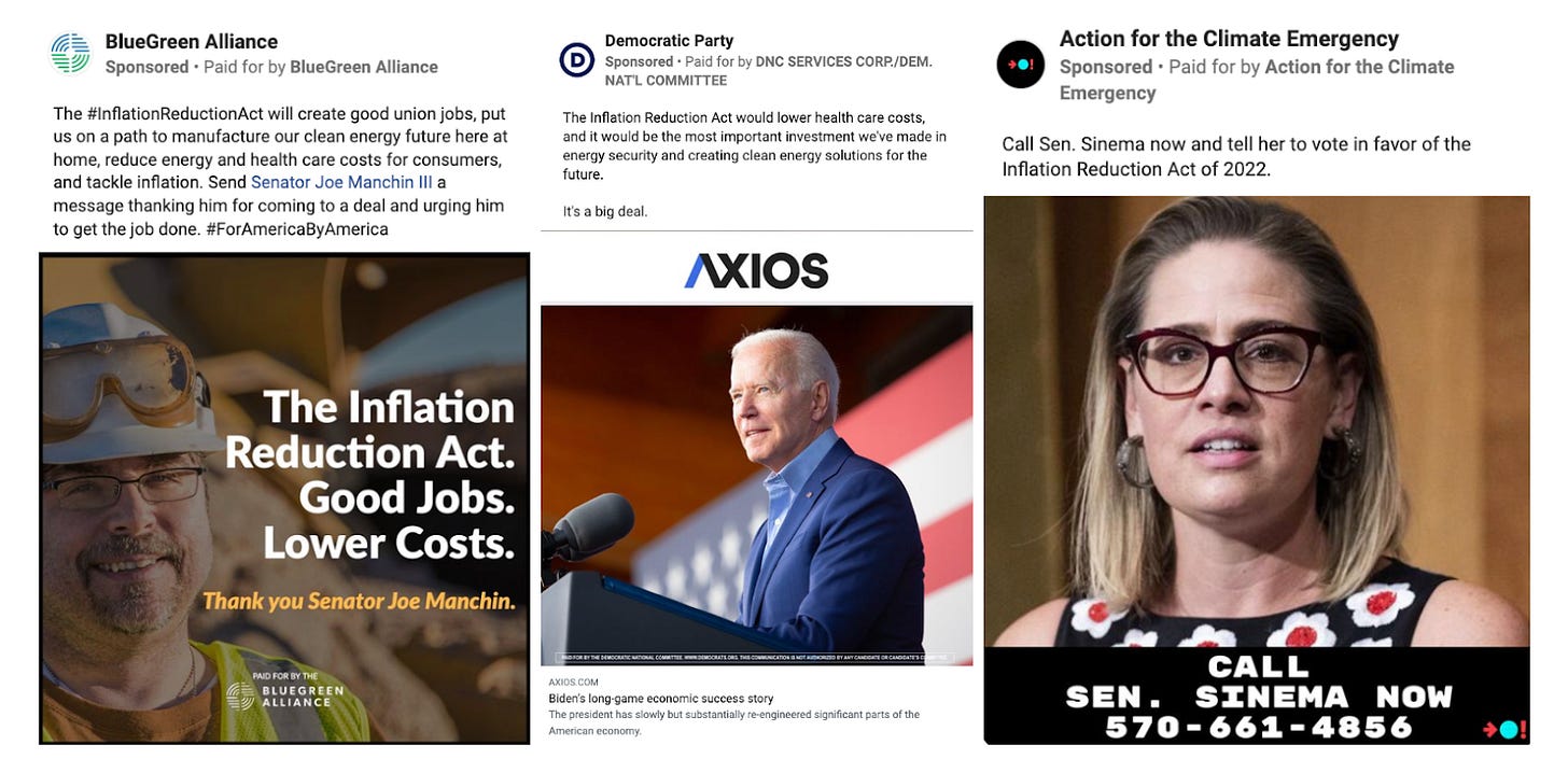 We saw 112 Facebook ads from two dozen advertisers mentioning “reconciliation” this week, and another 285 ads from around 60 advertisers mentioning the “inflation reduction act.” Some of the most notable ads on the Left came from Climate Power, Action for the Climate Emergency, BlueGreen Alliance, and the DNC, while on the Right we saw One Nation, Americans for Prosperity, and the National Association of Manufacturers try to kill the bill.