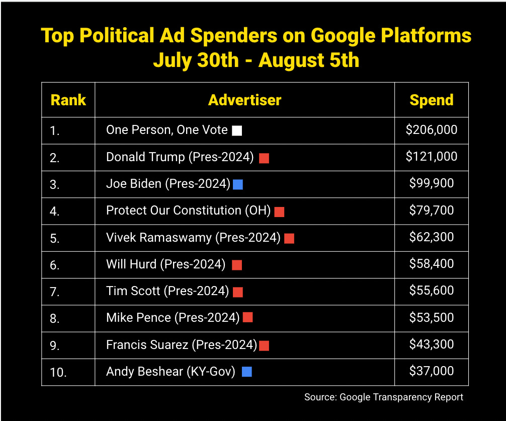 FWIW, here’s how much money likely or confirmed 2024 presidential candidates have spent on Facebook + Google ads to date (1/1 - 8/5):
