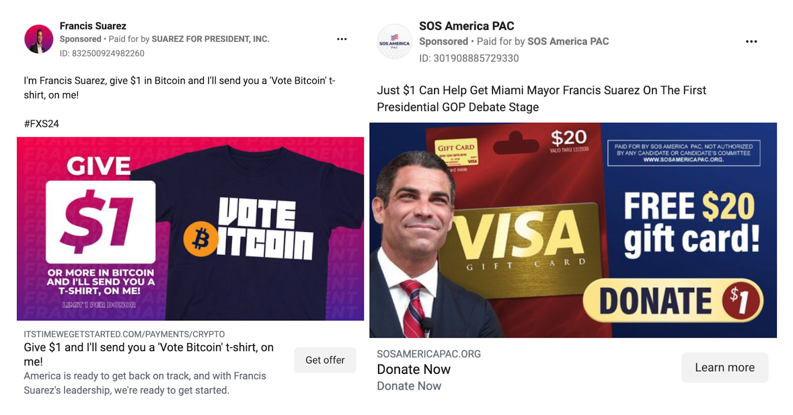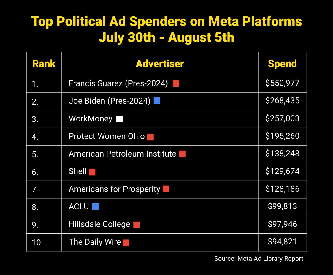 Miami Mayor Francis Suarez and his allied super PAC, SOS America, combined to spend a massive amount of money on Facebook and Instagram ads last week. The major ad buy was a Hail Mary attempt to collect enough new small-dollar donors to get onto the GOP debate stage on August 23rd. His team’s efforts paid off: on Monday, they announced they had reached the 40,000 donor threshold.
