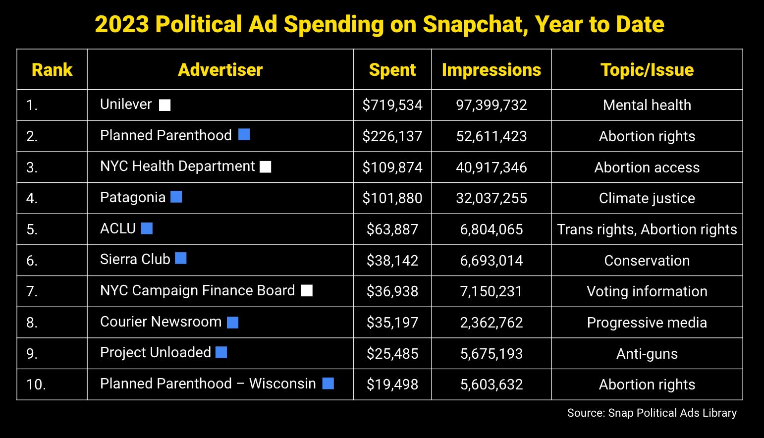 …and on Snapchat, political campaigns and organizations in the United States have spent around $1.6 million on advertising in 2023. Here are the top ten spenders YTD: