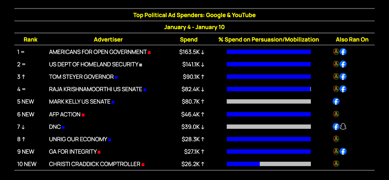 As was predicted in last week’s FWIW, Tom Steyer has ramped up spending across all platforms in the rapidly-heating California governor’s race. Former Rep. Katie Porter and Rep. Eric Swalwell are both up with fundraising spots, but their overall spend is dwarfed: Steyer at $350k overall in the last week, Porter with $3.3k, and Swalwell with $1k.