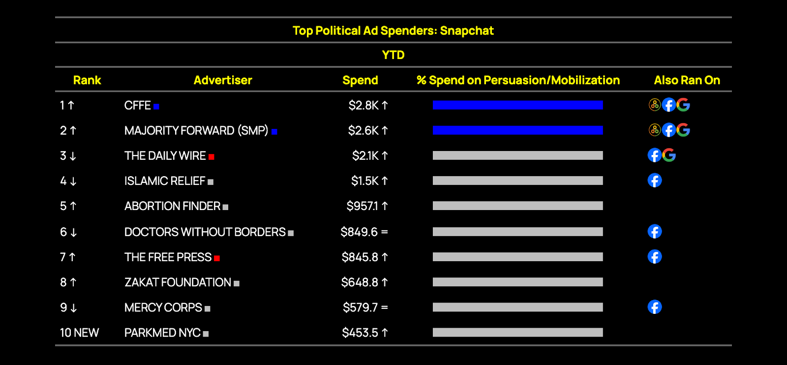 Finally, on Snapchat, political spenders have placed $22k in ads so far this year.