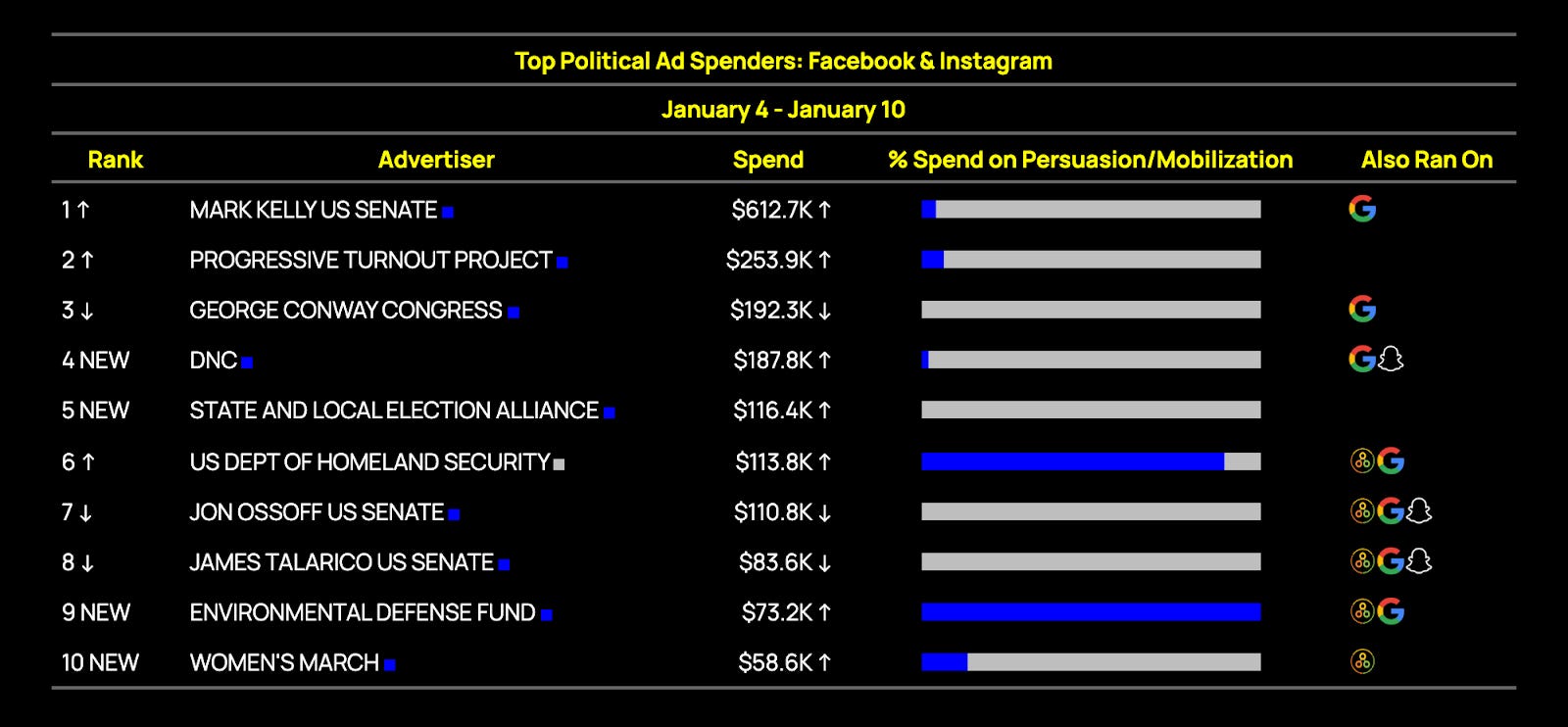 Democrats outspent Republicans significantly on Meta this week, with Senate candidates Ossoff and Talarico remaining in the top 10.
