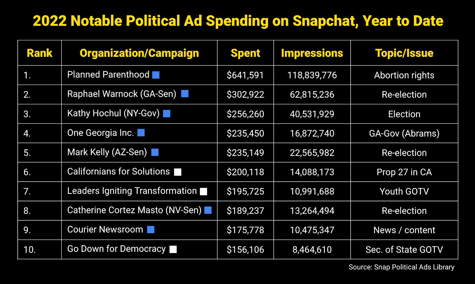 Meanwhile, GOP candidates and allied outside groups chose not to invest in Snapchat ads, leaving heavy Democratic spending on the youth-focused platform unanswered.
