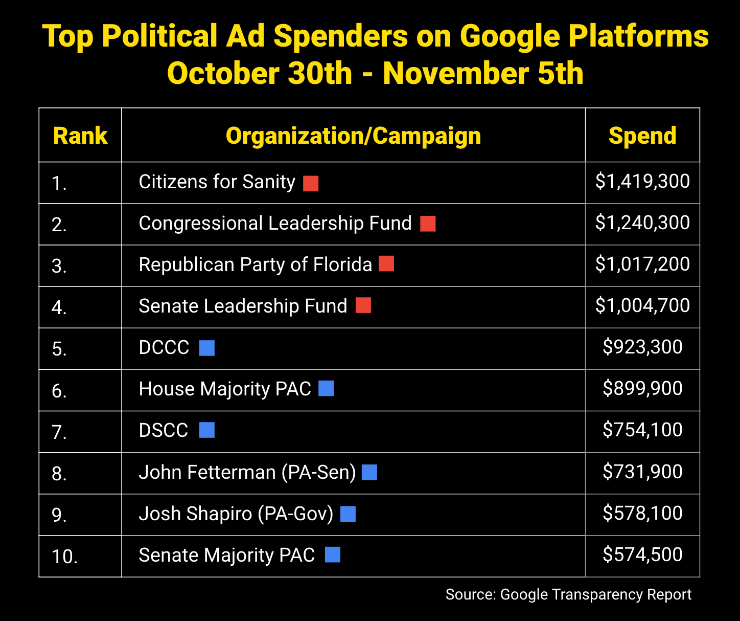 Last week, Republican outside groups like Citizens for Sanity, Senate Leadership Fund, and Congressional Leadership Fund flooded the zone on YouTube in a last-ditch effort to hit Democrats on crime and inflation. During the same time period, John Fetterman’s campaign spent over $730,000 on Google and YouTube ads - which was more than Dr. Oz’s campaign spent on the site targeting Pennsylvanians all year.