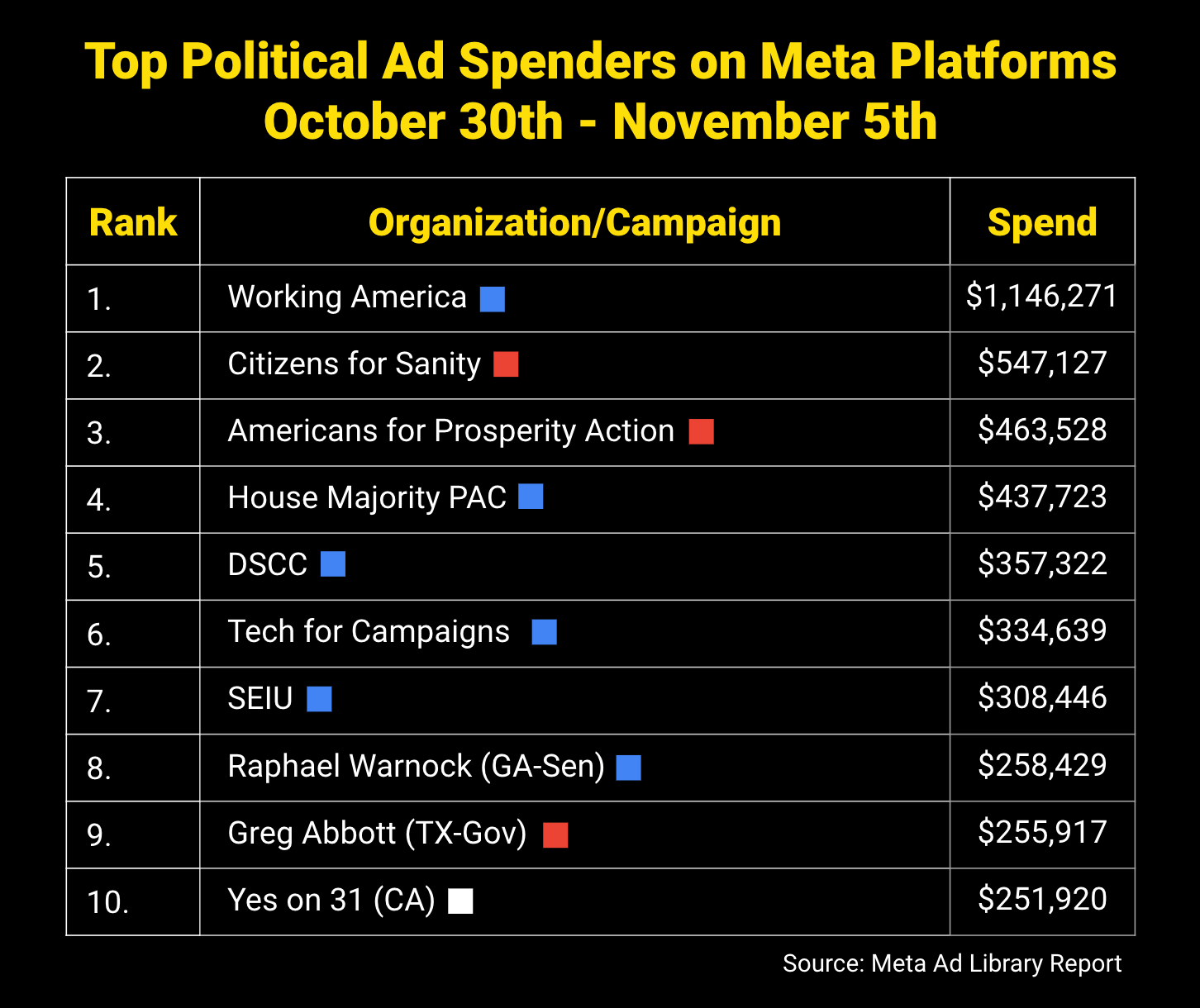 FWIW, here were the top-spending political advertisers on Facebook + Instagram in the campaign’s final full week: