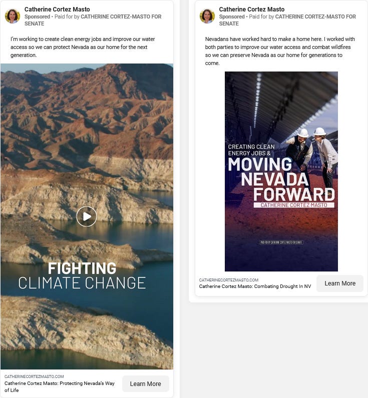 Sen. Catherine Cortez Masto is among the first battleground Senate candidates to run digital ads this fall about clean energy and climate change. Her new ads lead with improving water access, a critical issue as the Colorado River depletes, and in another smart move, primarily target Millenials, for whom climate change is a top issue.