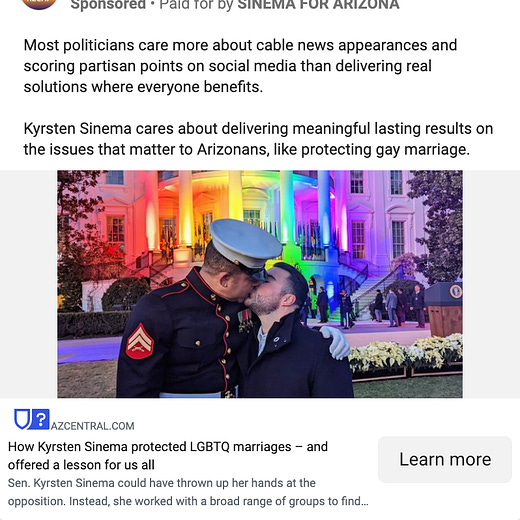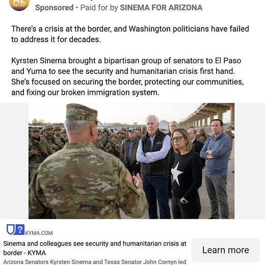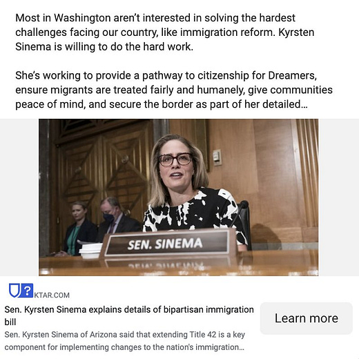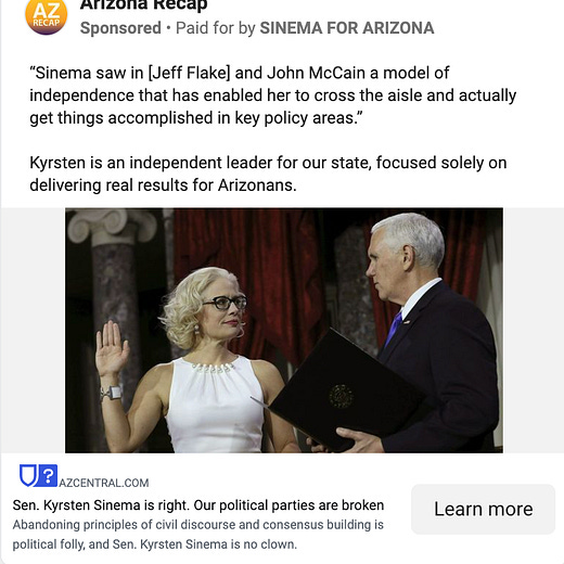 Last week, I noted that Sen. Kyrsten Sinema had launched some fundraising ads on Facebook ahead of a likely re-election campaign. Now, her team has launched a new wave of advertising targeting Arizonans with news articles intended to shore up her support in the state. Folks, she’s running.
