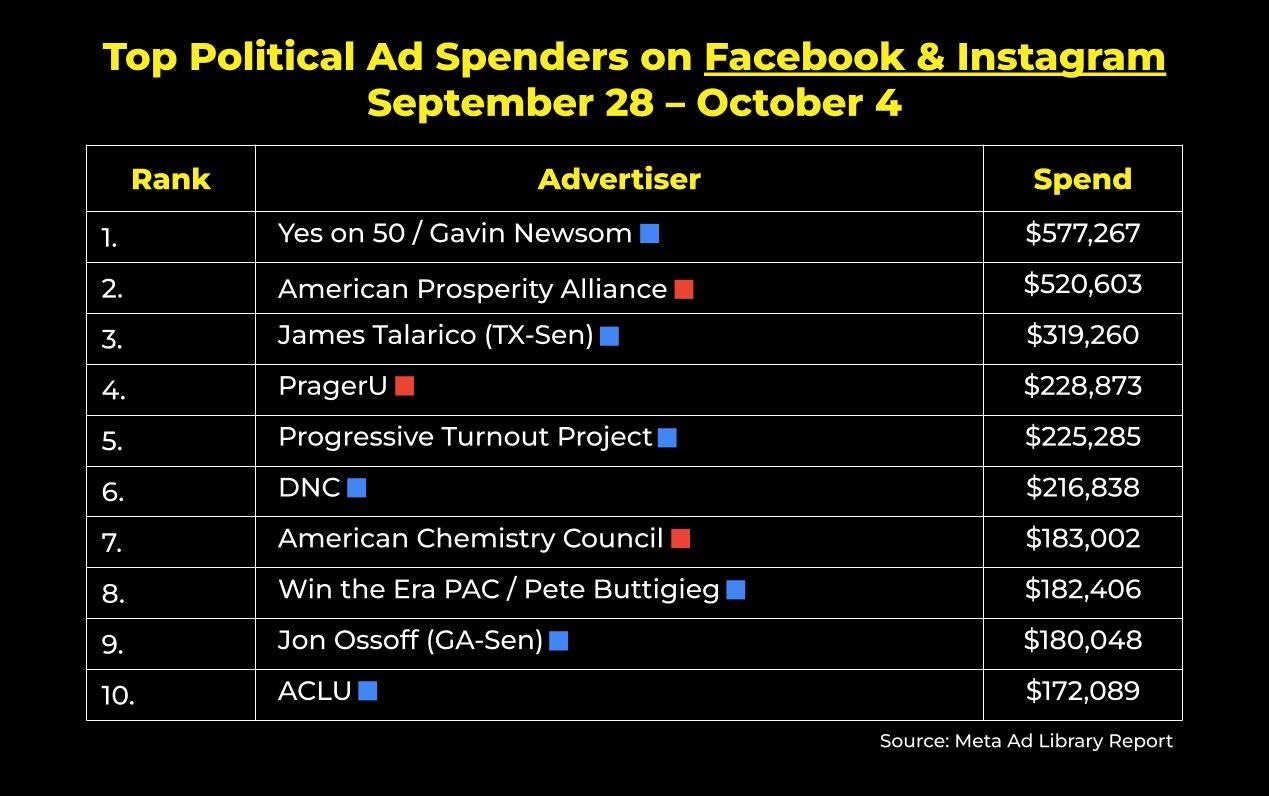 Perhaps most notable this week is the fact that this list is dominated by left-leaning campaigns and organizations for the first time since the middle of June. Whether this holds and becomes a trend as we get closer to Election Day remains to be seen.