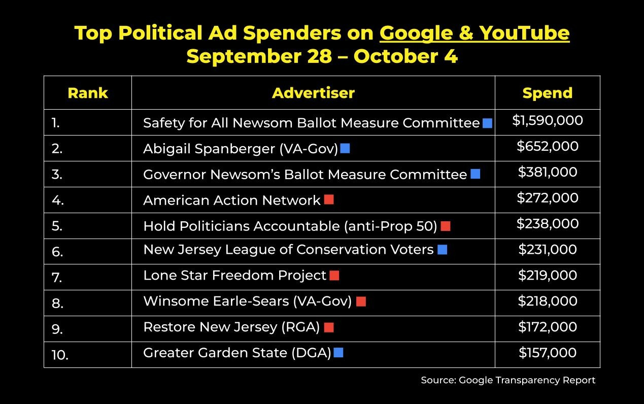 Meanwhile, political advertisers spent nearly $7.4 million on Google and YouTube ads last week. These were the top ten spenders nationwide: