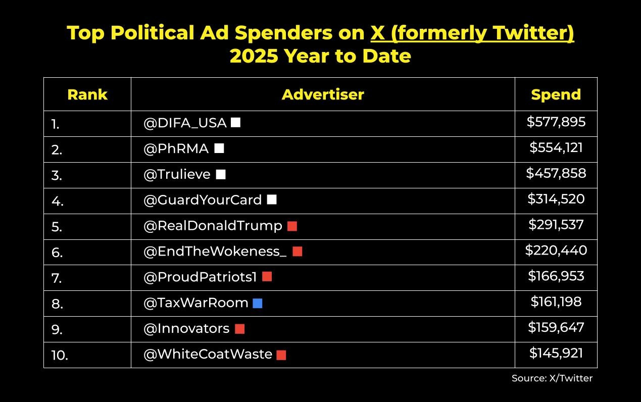 On X (formerly Twitter), political advertisers in the U.S. have spent around $8.1 million on ads in 2025. According to X’s political ad disclosure, here are the top spenders year to date: