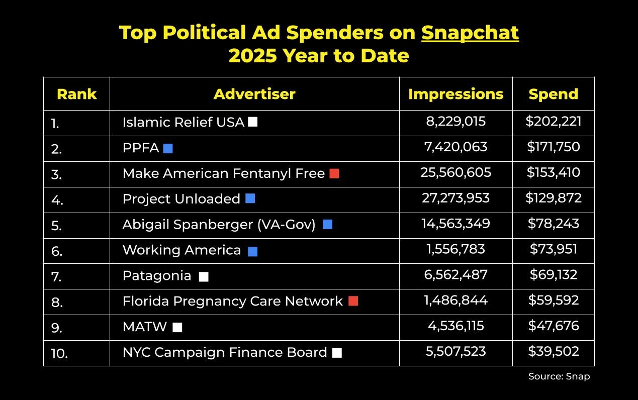 …and lastly, on Snapchat, political advertisers in the U.S. have spent around $1.7 million on ads in 2025. Here are the top spenders year to date: