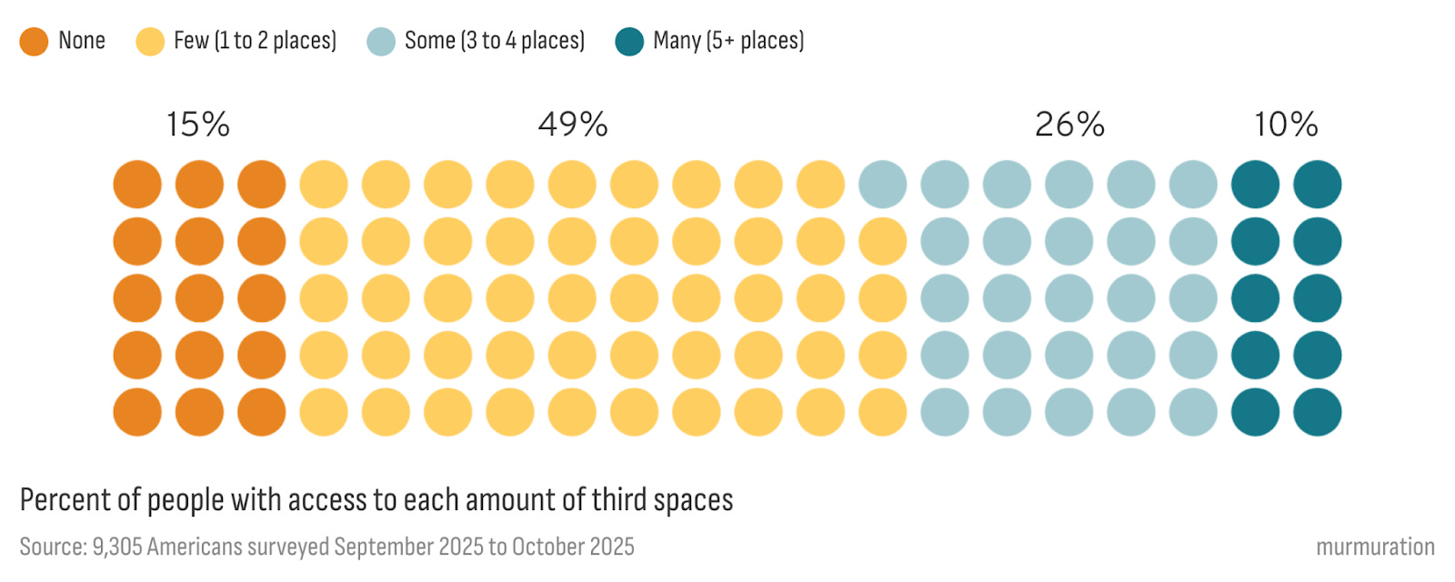 For today’s FWIW, I’m digging into what our latest data reveals about the slow disappearance of “third spaces” — the parks, libraries, and hangouts that hold communities together — and how their loss is quietly unraveling civic life itself: fewer people know their neighbors, fewer show up for local elections, and fewer feel connected to the decisions shaping their communities.